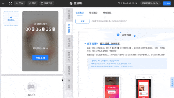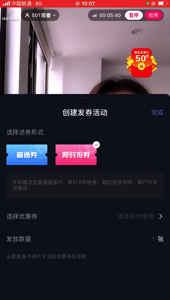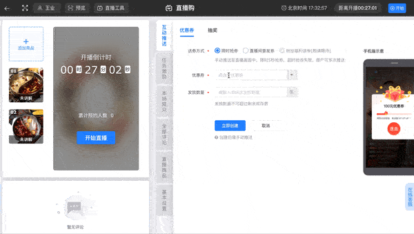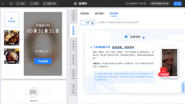 商家可在直播间设置多种优惠活动,如:“邀请好友进入直播间送福利”、“累计下单金额满299元送99元优惠券”、“观看满30分钟即可参与抽奖”等活动,有效实现用户拉新、促活、留存、转化。此外,商家可添加限量的定时优惠券和常规优惠券,在直播中进行推送,营造用户抢券的活动氛围,增强直播氛围,实现下单转化。